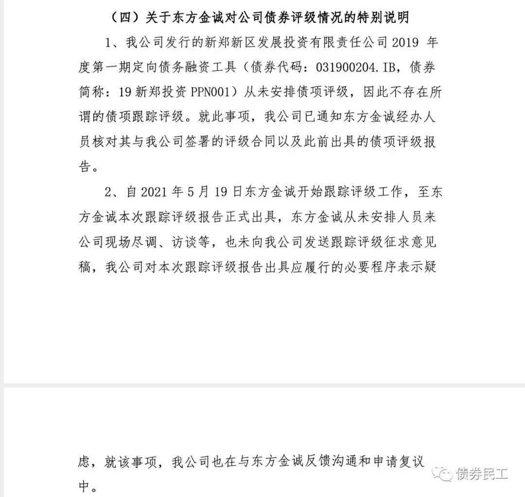 2021年6月29日,東方金誠的跟蹤評級報告評定新鄭新區發展投資有限責任公司(以下簡稱“新鄭投資”)發行的“18新鄭投資PPN001”和“19新鄭投資PPN001”的主體評級為AA+,評級展望由穩定調整為負面。新鄭投資在2021年7月2日發布了《關于東方金誠國際信用評估有限公司調整公司評級展望的公告》,明確申明了兩個特別說明:一是新鄭投資認為 “19新鄭投資PPN001”未做債項評級安排;二是新鄭投資認為東方金誠跟蹤評級未進行現場盡調訪談、也未征求公司意見,評級報告出具未履行必要流程,正在申請復議中。