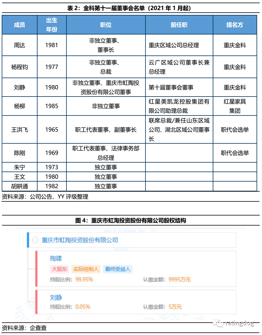 隨著2020年4月起融創放手,將所持11%金科股權轉讓給紅星家具集團并進一步減持,市場認為黃紅云對金科控制權步入穩定。但不料一年之后,黃紅云的家庭紛爭讓其控制權增添變數,引發監管發函詢問,上市公司的治理層面籠罩一層陰云。有關于黃紅云和前妻陶虹遐股權紛爭按時間順序梳理如下表。股權紛爭起源于雙方2017年離婚涉及的股權分配,但當時正值“野蠻人”蹲守門外虎視眈眈,雙方離婚后結為一致行動人,共御外敵,股權分割糾紛相對平靜。“野蠻人”離場后,分股計劃重新提上日程,內部博弈開始。2021年5月,黃紅云因為遲遲未完成股權分拆及過戶,成為被執行人;2021年6月28日,雙方完成離婚股權分配的過戶登記,金科控股將所持3.7167億股金科股份轉讓給由金科控股通過存續分立方式設立的虹淘公司。就在同一天,金科解除了兩位高管陶建、陶國林的職務,這兩位高管是陶虹遐的兄弟,引發陶虹遐反擊,陶虹遐發布《致金科全體員工的公開信》,并向董秘寄送了《關于限期發布解除<一致行動協議>的函》,要求解除與黃紅云的一致行動關系。至此,離婚財產分配糾紛上升至一致行動關系破裂。甚至引發深交所關注,向公司發函,要求披露解除一致行動關系的具體內容,并要求公司于7月16號前反饋材料并對外披露。截至本報告日,公司尚未披露答復。從去年融創放手到今年6月28日股權分割前,金科的股權結構一直穩定在下圖所示的格局。黃紅云及其一致行動人—金科控股、前妻陶虹遐、女兒黃斯詩合計持有金科29.9926%的股份,紅星家具集團持股11%,融創僅通過天津聚金持股3.87%。鑒于陶虹遐、黃斯詩將股東權利之表決權委托黃紅云行使,黃紅云享有29.9926%股比的表決權,以相對優勢掌握對金科的實際控制權,但股權結構相對分散。6月28日,金科控股將所持3.7167億股金科股份(占金科地產的6.9605%)轉讓給通過存續分立方式設立的虹淘公司。所謂存續分立,是指一個公司將一部分財產或營業依法分出,成立兩個或兩個以上公司的行為。股權過戶后,虹淘文化持有金科6.9605%股比,金科控股對金科的股比由14.205%降為7.2446%,其他股東持股比例不變。黃紅云在金科控股和虹淘文化股權結構中占比51%,陶虹遐占比49%。(1)若雙方就陶虹遐女士直接持有的股份(即占公司總股本2.49%的股份)解除一致行動關系,黃紅云實際可支配公司表決權的股份比例為27.5030%。(2)若虹淘公司亦與黃紅云先生解除一致行動關系,黃紅云實際可支配公司表決權的股份比例為20.5425%(說明黃紅云持股51%但并未控股,疑為存在其他協議)。情形(2)顯然對黃紅云更不利,對此他已找好援軍:金科公告稱,2021年7月8日,公司收到主要股東的書面文件,為保障和鞏固黃紅云對金科的實際控制地位,當黃紅云對金科實際可支配表決權的股份比例小于等于20.5425%的情況下,該主要股東將其持有公司6%股份比例的表決權委托給黃紅云先生行使,有效期為五年。此外,若虹淘公司與黃紅云解除一致行動關系,仍須滿足根據《上市公司收購管理辦法》及《上市公司收購及股份權益變動信息披露業務指引》(征求意見稿)的相關規定要求,在發布解除公告之日起的十二個月內繼續遵守一致行動等義務和承諾。則情形(2)下,一年內黃紅云對金科可支配表決權為27.5030%,一年后至五年內,黃紅云可支配表決權為26.5425%。目前來看黃紅云仍可保住實控人地位,但與其他家族創業企業相比,他的持股比例相對較小,股權分散留有隱患,融創的介入便是前車之鑒。據查,陶虹遐本人作為公司股東,未在金科內任職。其兄弟陶建被免職前擔任集團總裁助理兼招標采購中心總經理,陶國林被免職前擔任金科監察委員會的主任,均非房企內部不可替代的關鍵職位,預計離職后對公司經營業務的影響不大。董事會方面,金科于2021年1月29日股東大會通過了新一屆董事會,任期三年。根據非獨立董事的在職及過往任職經歷揣測親疏關系,周達、楊程鈞、王洪飛均有區域公司的工作經歷,應與創始人黃紅云關系更緊密。劉靜除了擔任金科董事以外,還任重慶市虹陶投資股份有限公司的董事,企查查顯示該公司大股東為陶建。因此,推測劉靜偏向于陶虹遐派系。4.1 銷售及土儲質量