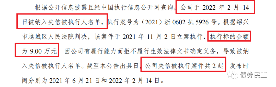 根據(jù)評(píng)級(jí)公司于2022年2月24日披露的關(guān)注公告,某城投公司因?yàn)閳?zhí)行標(biāo)的金額為9萬元的案件有履行能力而拒不履行相關(guān)義務(wù),于2022年2月14日被納入失信被執(zhí)行人名單。你沒看錯(cuò),執(zhí)行標(biāo)的金額真的是只有9萬?。?!