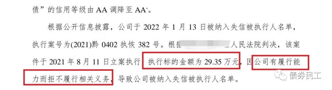 其實(shí)債券民工很不理解城投公司拒不履行生效法律文書的的這個(gè)選擇。不管是因?yàn)槭裁丛蛞鸬募m紛和訴訟,對(duì)于城投公司最好的選擇就是積極應(yīng)訴,不管是工程糾紛訴訟還是融資類金融訴訟。如果不服一審判決就申請(qǐng)二審,不服二審判決就申請(qǐng)?jiān)賹彛蝗绻賹徑Y(jié)果還是不滿意,那就要履行法院判決,這是最基本的規(guī)則。況且,該城投公司的主體信用等級(jí)剛從AA被下調(diào)至AA-,在這種情況下的這個(gè)選擇,對(duì)于城投公司自身來講,實(shí)在是沒有正面作用。
