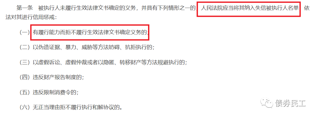 根據(jù)最高人民法院于2017年印發(fā)的《關(guān)于公布失信被執(zhí)行人名單信息的若干規(guī)定》,有履行能力而拒不履行生效法律文書確定義務(wù)、以偽造證據(jù)、暴力、威脅等方法妨礙、抗拒執(zhí)行的等六種情形需要納入失信被執(zhí)行人名單。根據(jù)評(píng)級(jí)公告的信息,這個(gè)城投公司屬于第一種類型,即“有履行能力而拒不履行生效法律文書確定義務(wù)”。