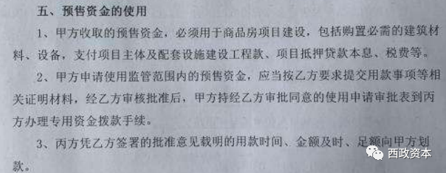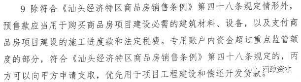 前面有提到,如果開發貸無法置換前融資金,那前融資金就得繼續等到項目預售且有足夠的回款后才能退出,其中預售的回款全部進入銷售監管賬戶后如何出款并歸還前融資金和開發貸就成為了問題的關鍵。一般來說,銀行等資金機構大都會要求開發商按照銷售進度歸集還本付息的資金,具體比如銷售提留、每月/每季度賬戶內新增資金的xx%扣劃還款保證金或直接用于還款等;或者也有要求開發商按照銷售面積的完成比例確定還本付息的安排,比如銷售達到一定面積則本金歸還到百分之幾之類的。因銷售監管賬戶的出賬屬于地方政府(一般是房管局)的常規監管事項,因此資金機構的扣款或劃款還得按照地方監管的政策來操作。