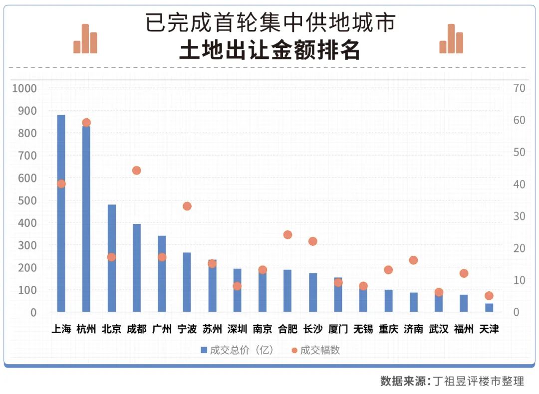 從已完成首輪集中土拍的城市來看,上海土地出讓金額仍排在首位,其次是杭州和北京。可以看出,上海市場仍然在房企投資中占據重要地位