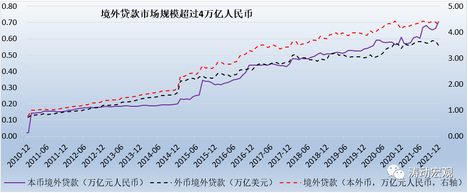 截至2021年底,金融機(jī)構(gòu)的本外幣境外貸款余額達(dá)到4.26萬(wàn)億元人民幣,占全部本外幣貸款的比例只有2.20%,可以看出市場(chǎng)空間實(shí)際上還未完全打開(kāi)。同時(shí)我們看到,4.26萬(wàn)億的本外幣境外貸款中,本幣境外貸款余額只有0.70萬(wàn)億,占比僅有16.55%,也即83.45%的本外幣貸款由外幣貸款構(gòu)成(余額達(dá)到0.56萬(wàn)億美元),因此相較而言,我們認(rèn)為本幣境外貸款的市場(chǎng)空間需要進(jìn)一步打開(kāi)。