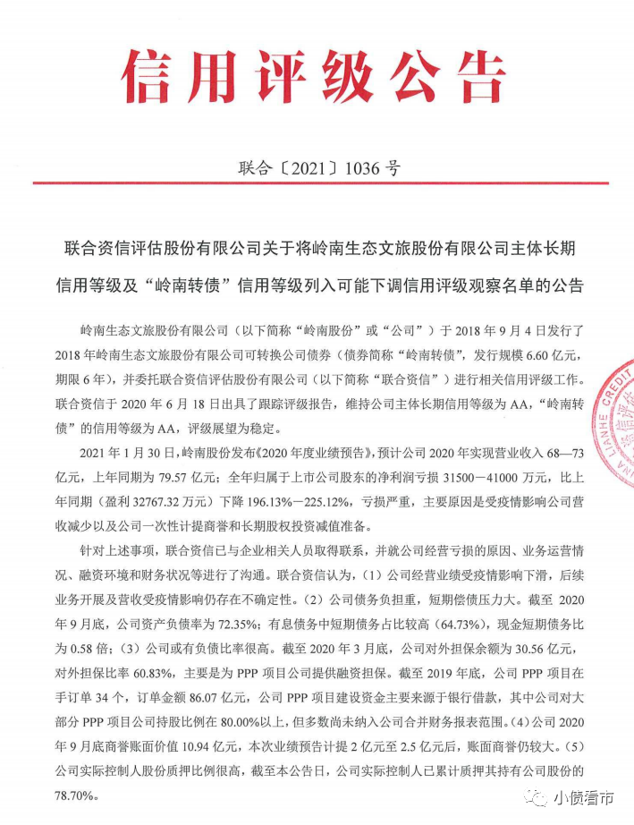 近日,聯(lián)合資信公告稱,將嶺南股份(002717.SZ)主體長期信用等級及“嶺南轉(zhuǎn)債”的信用等級列入可能下調(diào)信用評級觀察名單。