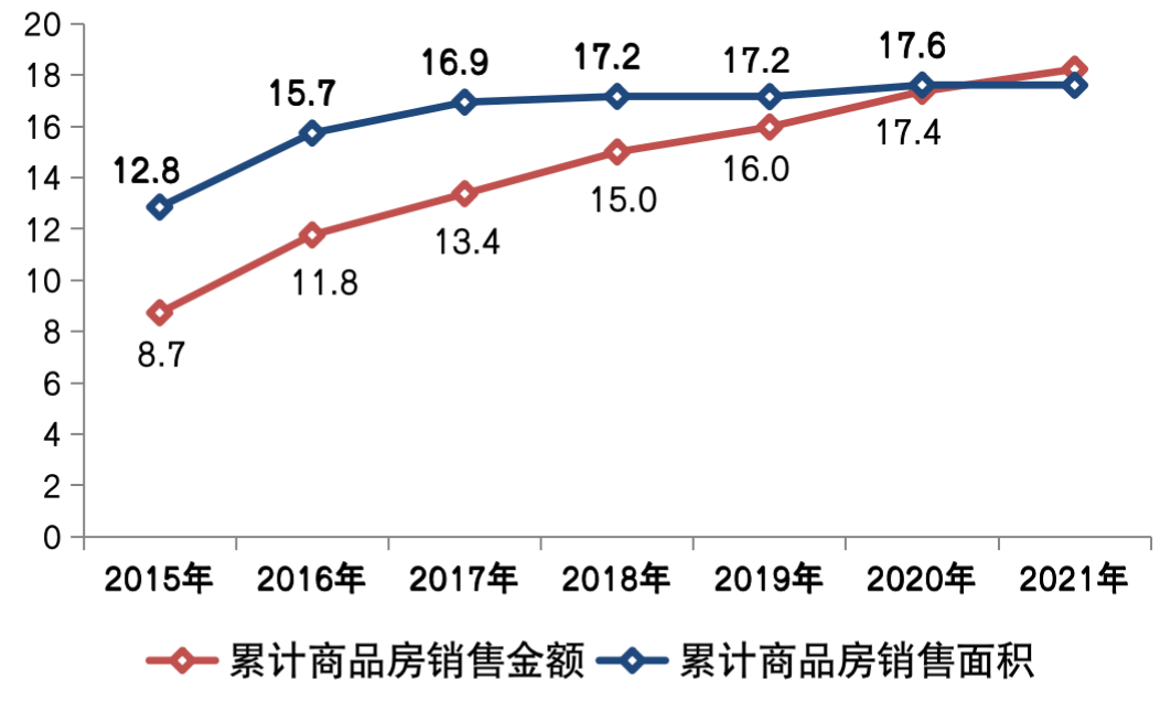 圖:2015-2020年全國商品房銷售金額、面積規模走勢(單位:萬億元、億平方米)