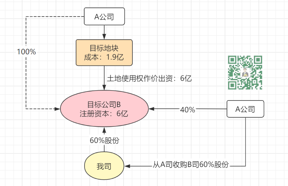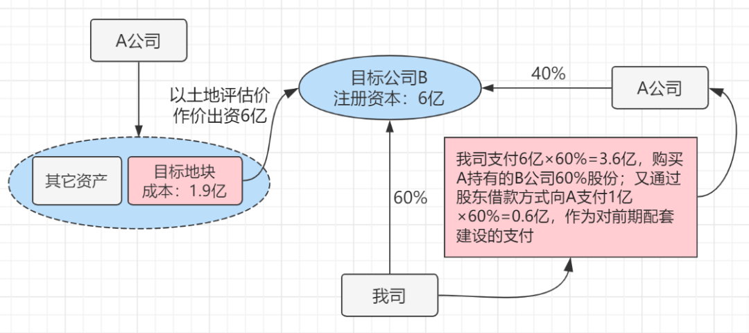 2.【土地作價入股】:A公司單獨(dú)成立項(xiàng)目公司。該地政府對于土地作價入股,不視同土地使用權(quán)轉(zhuǎn)讓,不受25%投資額的要求。目標(biāo)地塊評估價6億元(原始成本1.9億),全部進(jìn)注冊資本金。由于A公司后期表示想留有部分股權(quán)享受開發(fā)收益,因此在土地作價入股完成后,我司收購60%股權(quán)。