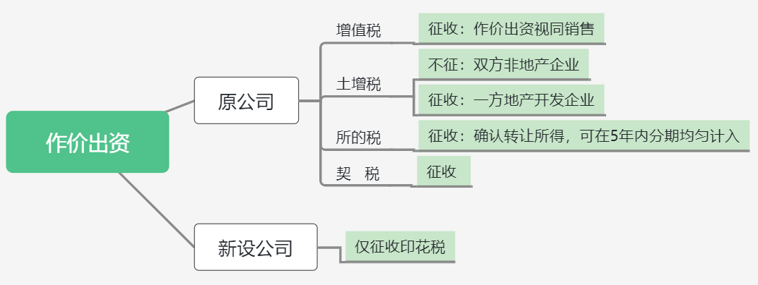 相較于資產(chǎn)轉(zhuǎn)讓,作價出資有兩點(diǎn)優(yōu)勢:一是,在部分要求較為寬容的城市作價出資不受25%的投資額限制;二是,作價出資在“所得稅、土增稅”上存在籌劃空間,尤其所得額可在5年內(nèi)分期計(jì)入,對于降低現(xiàn)金流峰值好處很大。