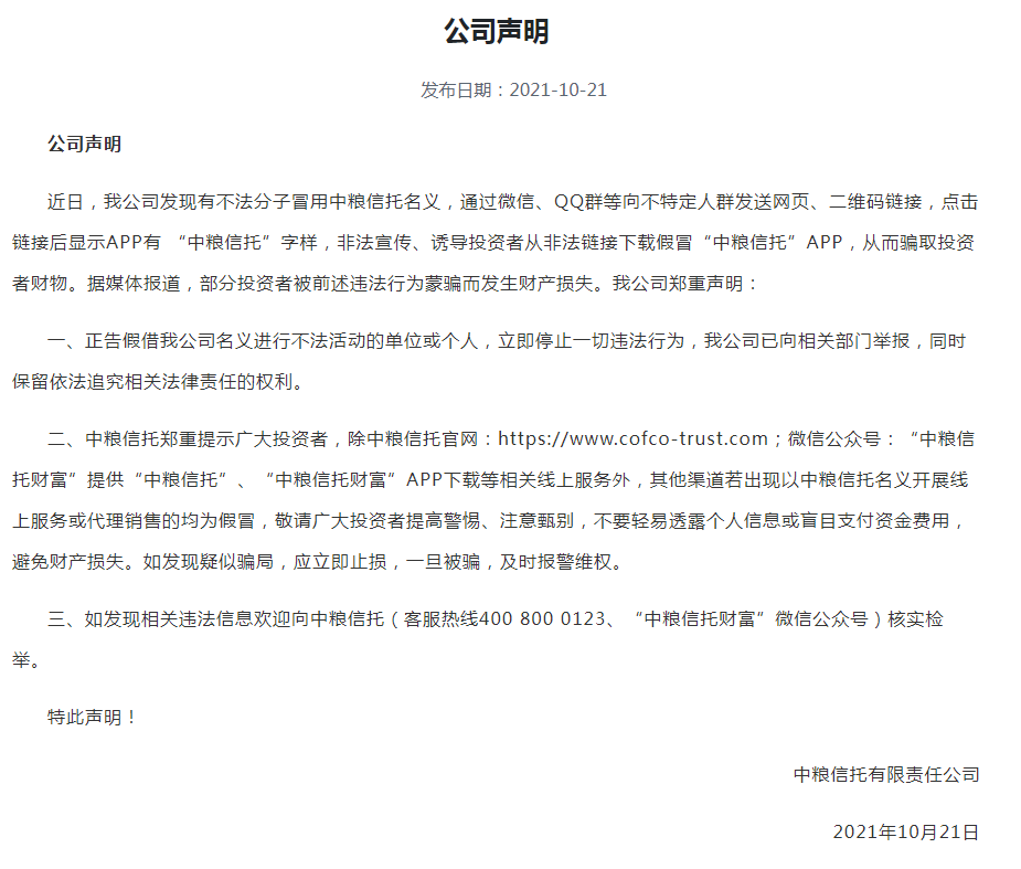 去年躺槍的有某基金、知名私募、信托的中信和安信也紛紛發公告表示這一問題。數據顯示,近10家信托公司發布了聲明,稱有不法分子冒充信用公司名義進行金融詐騙。