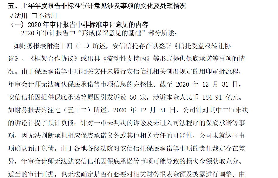 按照原先的判斷,起碼安信信托還會留著一點點的凈資產;沒想到董事會和管理層也真的是夠狠,直接確認了安信信托“資不抵債”的命運。而關于凈資產為負的理由,官方的描述是這樣的: