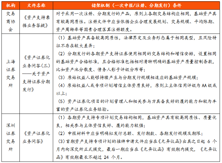 從三監(jiān)管機構(gòu)的規(guī)定看,儲架模式需要至少需要滿足交易結(jié)構(gòu)、基礎(chǔ)資產(chǎn)、增信主體三方面要素的相似性。