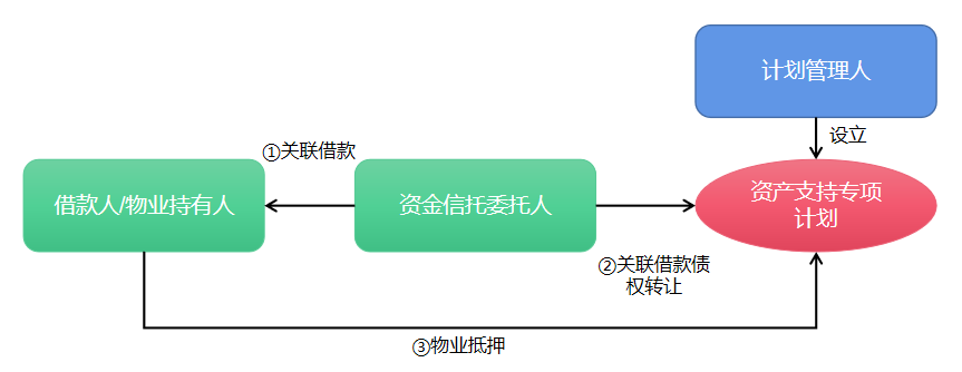 結(jié)構(gòu)概述:在該模式下,原始權(quán)益人通過委托貸款銀行向借款人/物業(yè)持有人發(fā)放委托貸款,享有委托貸款債權(quán),同時物業(yè)持有人將物業(yè)抵押給委貸銀行;計劃管理人設(shè)立專項資產(chǎn)支持計劃募集資金向原始權(quán)益人購買其持有的委托貸款債權(quán)。代表性案例:深圳益田假日廣場資產(chǎn)支持專項計劃
