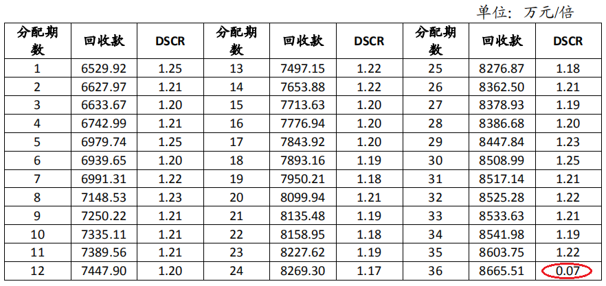 以“北京城市副中心投資建設(shè)集團有限公司2019年度第一期資產(chǎn)支持票據(jù)”為例,最后一期回收款對優(yōu)先級證券的應(yīng)付本息覆蓋倍數(shù)僅有0.07倍,可以推測,最后一期的優(yōu)先級證券本金明顯較大。聯(lián)合評級披露,本交易優(yōu)先級票據(jù)的到期本息償付將依賴于發(fā)起機構(gòu)的再融資能力或抵押物處置變現(xiàn)價值,故聯(lián)合資信對于本交易 DSCR 測算不考慮最后年份。