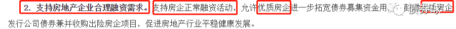 這一條重點(diǎn)自然不在“支持房企正常融資活動(dòng)”,作為官方機(jī)構(gòu),如果連正常融資活動(dòng)都不支持,肯定不合適。對(duì)于這部分,筆者關(guān)注的重點(diǎn)在于“優(yōu)質(zhì)房企”。從具體內(nèi)容來(lái)看,如果發(fā)行人被認(rèn)定為優(yōu)質(zhì)房企,其將獲得的政策支持是毫無(wú)疑問(wèn)的。可惜的地方在于,這里并沒(méi)有給出優(yōu)質(zhì)房企的標(biāo)準(zhǔn),大概監(jiān)管部門(mén)也有難為的地方吧。