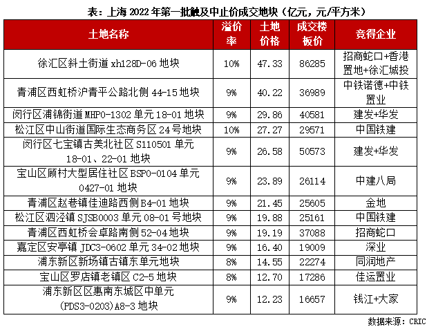 1)觸及中止價成交地塊:共有13宗,主要集中在近郊熱點成交板塊,如閔行古美、浦江、松江新城、青浦趙巷、西虹橋等板塊。這些板塊配套較為成熟,購房客戶認可度較高,板塊內項目去化表現比較佳,如青浦趙巷板塊內項目在上海今年一批次新房開盤去化率接近100%,房企拿地風險相對較小,土地市場競拍熱度相對較高。此外,中心城區也有1幅地觸及中止價成交,該地塊為徐匯區斜土路街道地塊,由招商蛇口、香港置地、徐匯城投聯合體以47.33億元的總價斬獲,溢價10%。