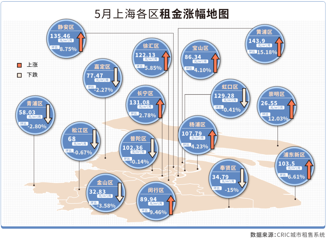 克而瑞租售監測的數據顯示,5月上海個人房源月租金每平米破百元,排在全國之首,同環比均有所上漲,其中環比漲幅排在全國前三。