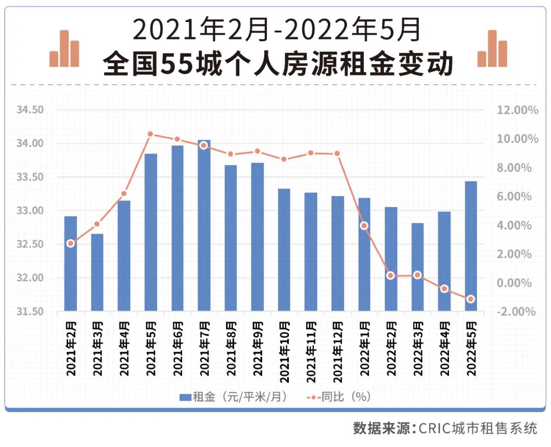 克而瑞租售數據顯示,5月,55城個人房源租金為33.43元/平方米/月,環比上升1.36%。不過租金水平仍然不及去年同期。