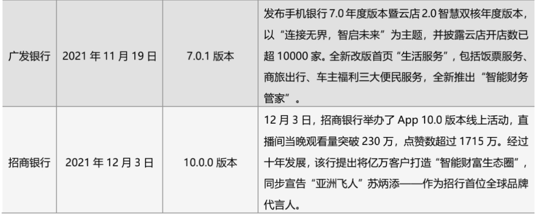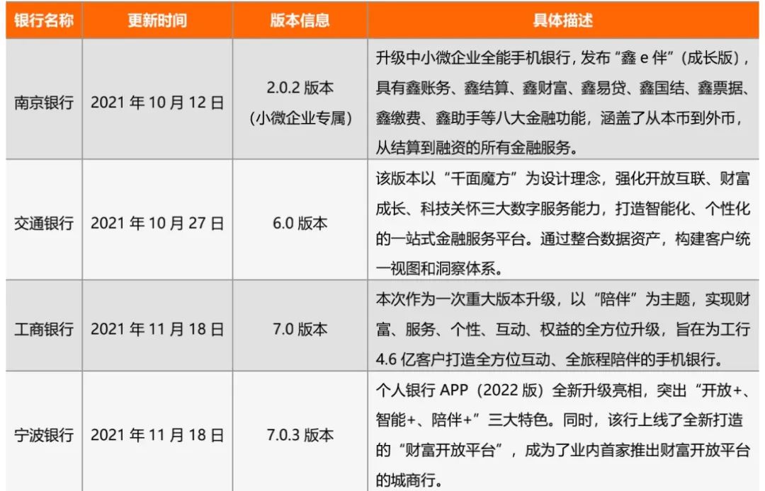 表 4:2021年下半年典型手機銀行更新版本介紹