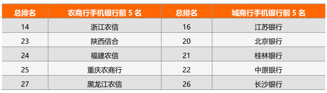 相較于全國性銀行,一批中小商業銀行的用戶數量增速更為顯著,表現出逐步趕超部分全國性股份制銀行的發展趨勢。身處后疫情時代,多數中小銀行已經陷入“數字化轉型如何做的焦慮迷茫之中”,因此亟需通過手機銀行來實現重塑數字基因。結合2021年3季度的手機銀行TOP 100名單,零壹智庫分別選取了城商行、農村金融機構各自排名前5位,綜合各項指標來看,除了浙江農信之外,城市商業銀行手機銀行App的整體排名高于農村金融機構。