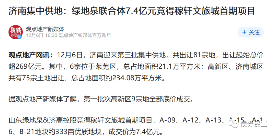 2021年12月6日,濟南市投資控股集團有限公司聯合山東綠地泉以7.4億元的價格摘得稼軒文旅城首期項目總出讓面積為333畝的土地。