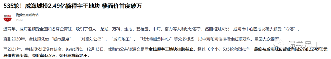 2021年12月13日,威海城市投資集團有限公司子公司威海城投置業有限公司以2.49億元的價格摘得金線頂宇王地塊總出讓面積為18686平米的土地,土地性質為住宅用地。
