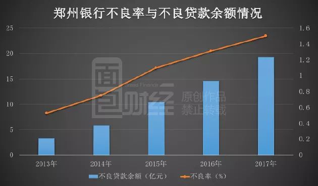 鄭州銀行逾期貸款總額由2012年末的6.36億元上升至于2017年末的68.77億元,5年增長9.8倍。但翻查歷年年報發現,鄭州銀行的貸款總額,從2012年的501.61億元增長至2017年的1284.56億元,增長不到3倍。