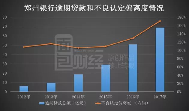 同期鄭州銀行不良貸款偏離度也在明顯抬升,截至2017年底鄭州銀行不良偏離度已經超過170%。