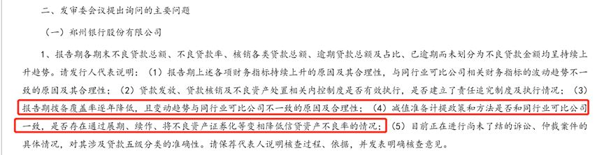 發審委關注鄭州銀行的逾期貸款大幅增長情況,是有道理的。逾期貸款往往會牽涉到不良貸款的認定情況,這直接影響的是不良貸款率,而不良貸款認定的松緊,則又會涉及貸款減值的問題,最終影響的就是利潤。