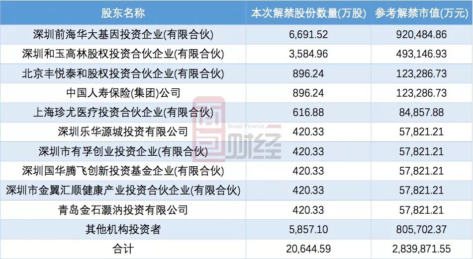 先來看公司即將解禁股份的情況。下表是華大基因持有此次解禁股份的股東名稱及其解禁數量: