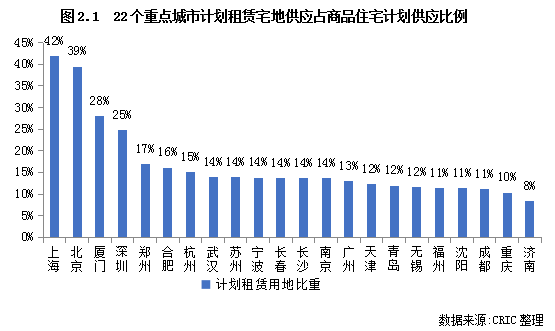 通過對(duì)22個(gè)重點(diǎn)城市2021年供地計(jì)劃中商品住宅及租賃住宅用地的規(guī)模進(jìn)行梳理和測算,結(jié)果發(fā)現(xiàn):除濟(jì)南外,其余21個(gè)城市租賃房供地計(jì)劃占比均高于10%,尤其是北京和上海兩個(gè)一線城市,租賃宅地占商品住宅用地的比重均在四成左右;其次是廈門、深圳、合肥、杭州等城市,比重均超15%;余下的重點(diǎn)城市中,除濟(jì)南相對(duì)較低之外,其余城市租賃宅地計(jì)劃供應(yīng)量均按照中央10%的“紅線”設(shè)置,約在10%左右。