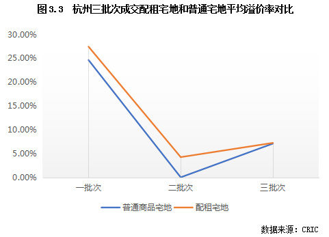 從上節(jié)可以看出,配租宅地往往位于中心城區(qū)及郊區(qū)的熱點(diǎn)片區(qū),而普通商品住宅用地則大多位于臨安等遠(yuǎn)郊片區(qū)或?yàn)橥恋匦再|(zhì)較為復(fù)雜的宅地,房企拿地意愿不高。因此,從成交溢價(jià)率來看,配租宅地的平均成交溢價(jià)率往往也高于普通商品住宅地塊,即使在熱度明顯下降的第二批亦是如此。