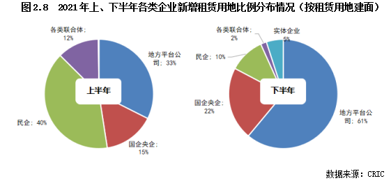 而進(jìn)入下半年以后,民企投資態(tài)度發(fā)生大幅轉(zhuǎn)變,不再積極拿地,即使拿地也不再積極競拍至需要競配建的輪次,因此新增租賃用地建面大幅下降,占比下滑至10%;反之國企央企、地方平臺(tái)公司新增租賃用地的比例大幅提升,國企央企提升至22%,地方平臺(tái)公司更是提升至61%,成為各地新建租賃用房的主力。