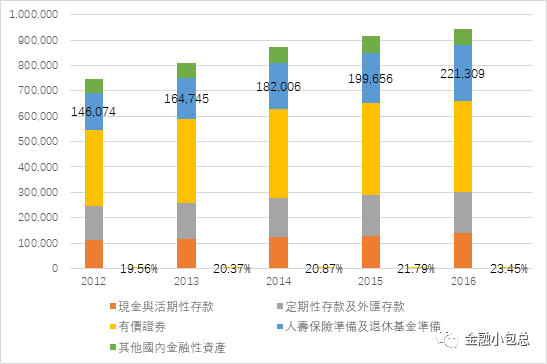 此外,臺灣地區稅法賦予年金險每人每年24000新臺幣的稅費減免也促進了保險產品的發展。目前保險產品已經成為臺灣地區家庭部門資產配置的主要組成部分,長期維持在24%上下。