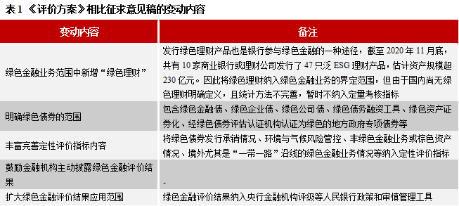 6月9日,人民銀行發(fā)布《銀行業(yè)金融機(jī)構(gòu)綠色金融評(píng)價(jià)方案》,是在2020年7月21日《關(guān)于印發(fā)〈銀行業(yè)存款類金融機(jī)構(gòu)綠色金融業(yè)績?cè)u(píng)價(jià)方案〉的通知(征求意見稿)》(以下簡稱“征求意見稿”)的基礎(chǔ)上發(fā)布的正式版本。《評(píng)價(jià)方案》將于2021年7月1日起施行。評(píng)價(jià)指標(biāo)和方法上采用定量(權(quán)重80%)和定性(權(quán)重20%)結(jié)合的方法,其中定量指標(biāo)有4個(gè),定性評(píng)價(jià)指標(biāo)有3個(gè)。與征求意見稿相比,正式版《評(píng)價(jià)方案》的變動(dòng)如下表所示。