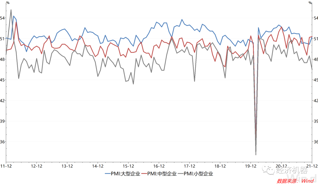 2)大型企業(yè)景氣度提升,小型企業(yè)景氣度放緩顯著。12月,大中小型企業(yè)依舊呈分化態(tài)勢,與11月不同的是,12月大型企業(yè)恢復較好,小型企業(yè)景氣度惡化。其中,大型企業(yè)PMI為51.3%,較上月提升1.1個百分點;中型企業(yè)PMI與上月基本持平,維持在擴張區(qū)間;小型企業(yè)PMI為46.5%,較上月回落2個百分點(圖2)。這表明,在疫情反復的當下,中小企業(yè)仍面臨極大經營困境,需要在政策上提供更有力的支持,這與12月中旬國常會繼續(xù)部署加大中小微企業(yè)支持力度是一致的。