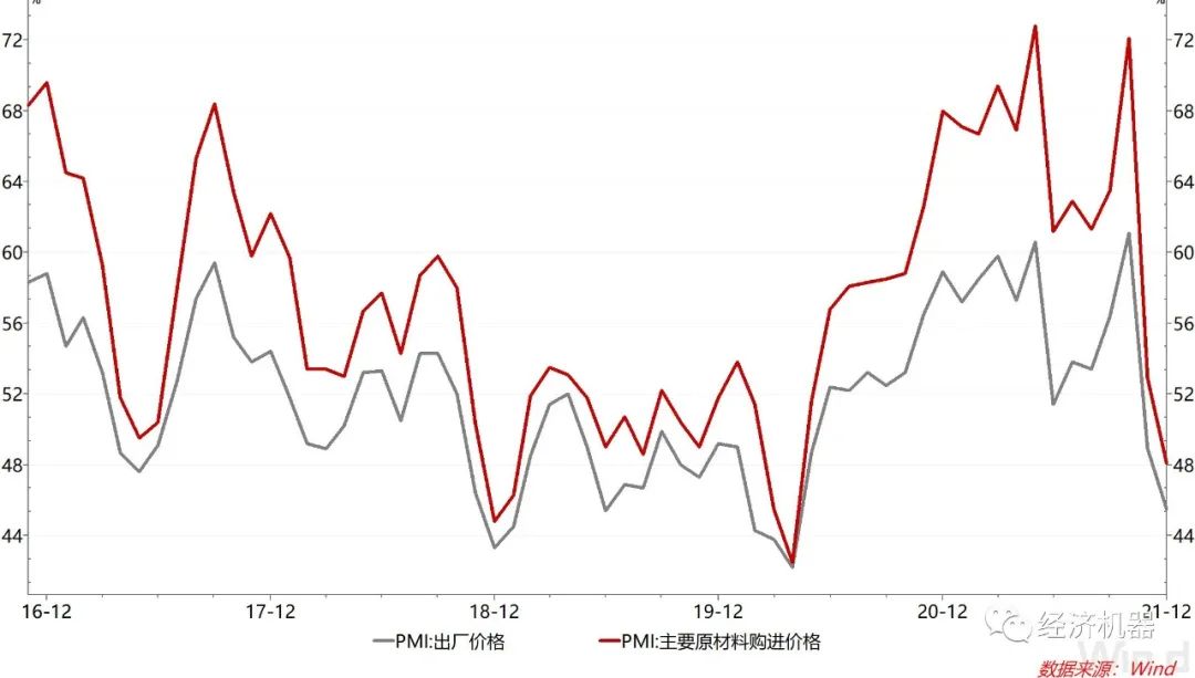 隨著能源保供政策效果的顯現(xiàn),主要原材料價格已出現(xiàn)明顯回落。不過近來,不同品種走勢也開始出現(xiàn)分化,比如12月動力煤的期貨價格仍在低位震蕩,而焦煤價格則受房地產、基建預期好轉等因素的影響,與螺紋鋼價格類似,近來出現(xiàn)持續(xù)上漲(圖4)。布倫特原油價格則因對奧密克戎疫情的擔憂得到緩解而開始回升,12月也累計了15%的漲幅。預計企業(yè)經營成本未來將不會再有大幅的下降。