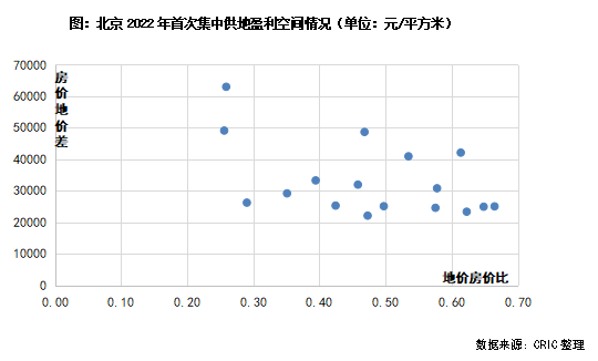 反之北京城建競得的豐臺區[2022]003號地塊,成交樓板價為22008元/平方米,銷售指導價達到88000元/平方米,地價房價比僅有0.26,房價與地價的差值更是在6萬元/平方米以上。但地塊存在5.4萬平方米的產業用地,且有9800平方米的保障房,運營的復雜系數較高,因此最終仍是底價成交。