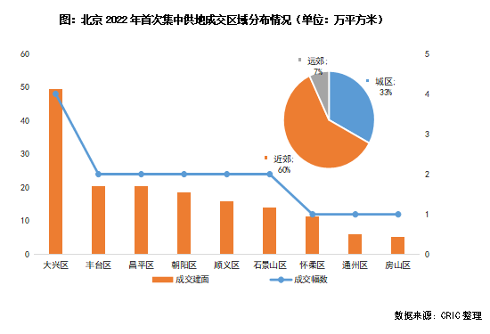 從地塊的區域分布來看,近郊區持續成為北京土地供應的主力區域:大興區共成交4宗地,總建面達到49.27萬平方米,位列第一名;其次昌平區、順義區、通州區和房山區均有地塊出讓,近郊供應面積共計96.72萬平方米,占60%。