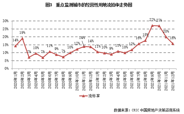 2021年12月,在17城三輪集中土拍收官及三四線(xiàn)城市土地成交放量的拉動(dòng)下,年末土地成交翹尾現(xiàn)象如期而至,當(dāng)月成交規(guī)模突破4億平方米,同比也僅下降了3%。與此同時(shí),信貸環(huán)境邊際改善下,土地流拍現(xiàn)象也有所好轉(zhuǎn),集中土拍的重點(diǎn)城市中僅個(gè)別城市流拍率較上一輪大增。