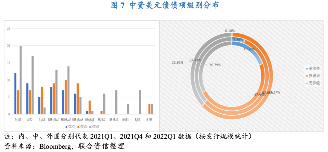 從評級狀況來看,2022年一季度中資美元債無評級[7]發行規模為140.7億美元,占總發行規模的37.2%,環比和同比分別上漲了0.4個和4.3個百分點。本季度采用備用信用證發行的企業明顯增多,銀行信用背書有助于對債券進行增信,得到投資人的認可和青睞,使得市場評級需求有所下降,因此無評級發行規模有所增加。