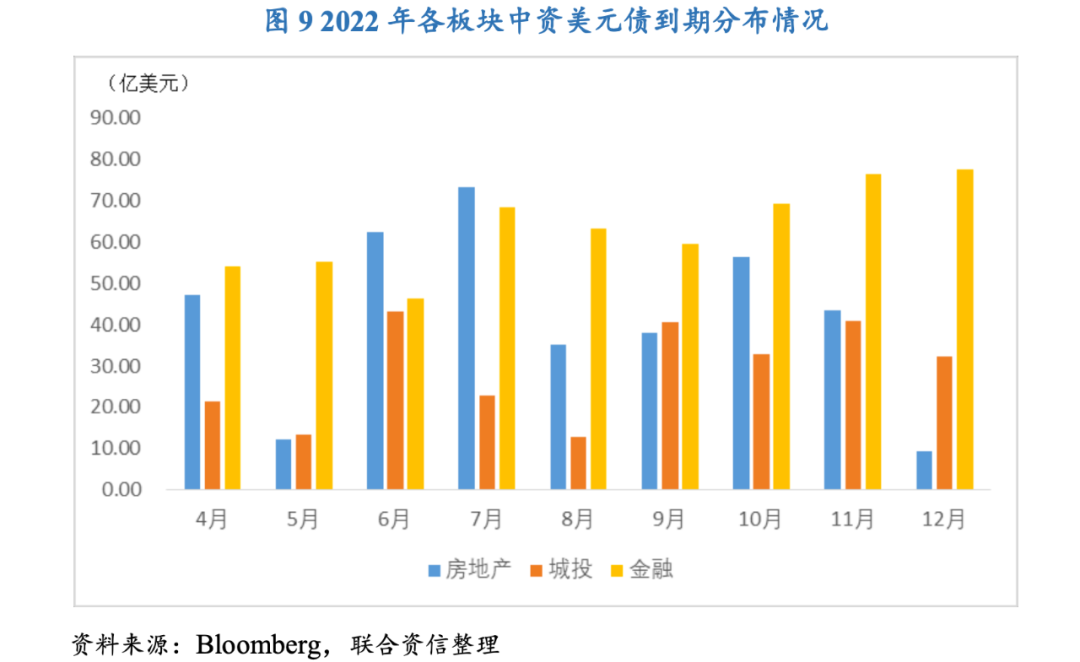 房地產板塊將在二季度迎來兌付小高峰,預計2022年房地產板塊融資的剛性需求增強,但不同資質主體的信用環境存在較大差異;城投板塊將在四季度面臨集中兌付的壓力,美元債規模存量較高且信用等級較低的發行主體將面臨一定程度的再融資風險
