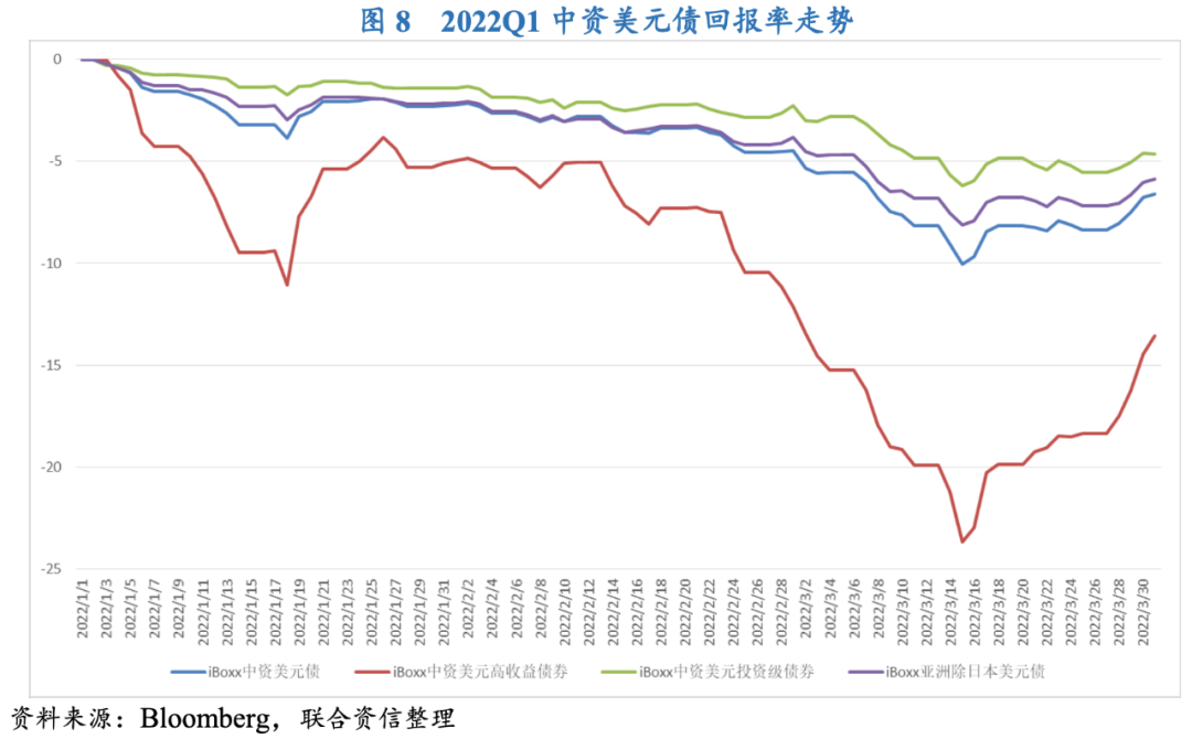 2022年一季度,從宏觀環境上看,受美聯儲加速貨幣政策調整以及俄烏沖突爆發的影響,投資者避險情緒得到明顯增強,對中資美元債的投資需求有所下降。中國3月疫情再度蔓延且政府采取嚴格的疫情防控舉措,對中國經濟增長以及部分中資企業復工復產造成一定影響,國際投資者對中資企業表現稍有悲觀。另一方面,本季度信用風險事件仍在持續發酵,其中中國奧園、正榮地產和融創中國等爆發的信用風險事件進一步加重了市場的擔憂情緒,多重因素作用下本季度中資美元債回報率延續了下跌走勢。但3月中旬,多部委聯合發聲對市場情緒起到一定提振作用,各板塊中資美元債回報率也隨之應聲上漲,其中高收益中資美元債漲幅較大。
