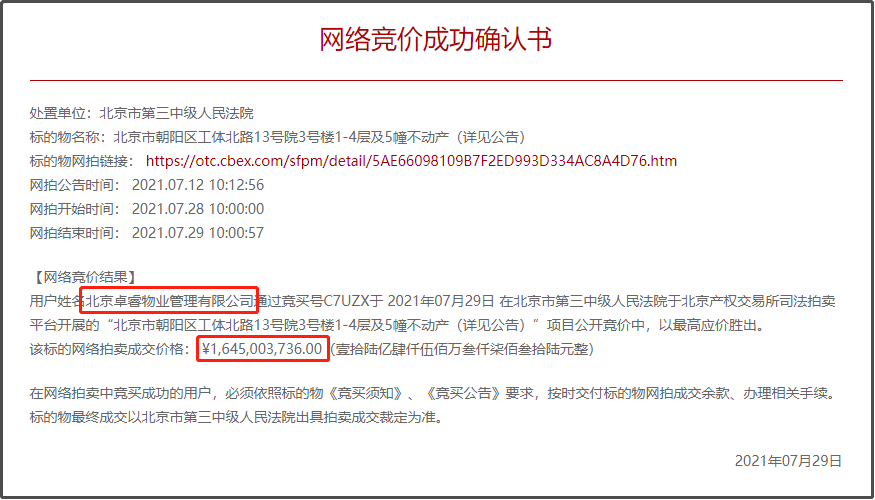 據北京交易產權網顯示,北京市朝陽區工體北路13號院3號樓1-4層及5幢不動產于2021年07月28日10時開始網拍,在經歷24小時后,于2021年07月29日10時左右被北京卓睿物業管理有限公司以16.45億元的價格成功拍下。