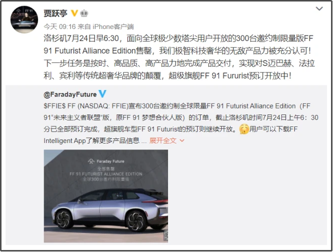 7月28日,賈躍亭在微博中表示,“洛杉磯7月24日早6:30,面向全球極少數塔尖用戶開放的300臺邀約制限量版FF 91 Futurist Alliance Edition售罄”。