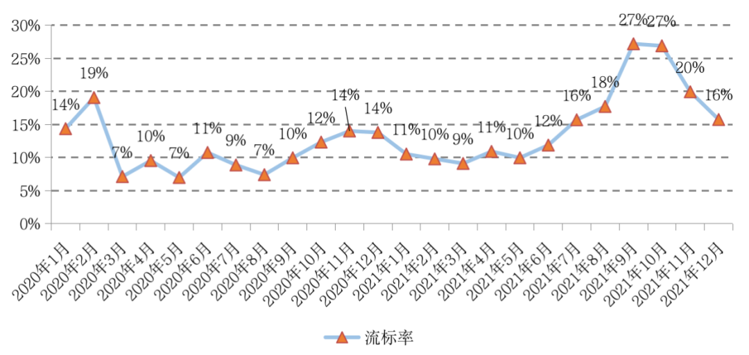 圖:重點(diǎn)監(jiān)測(cè)城市的經(jīng)營(yíng)性用地流拍率走勢(shì)圖