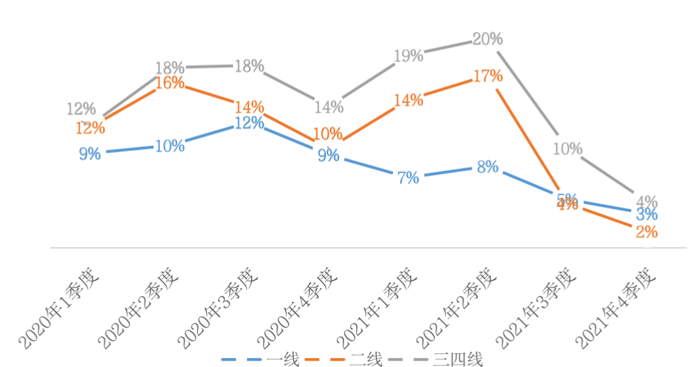 圖:2020年-2021年一、二和三四線土地成交溢價(jià)率季度趨勢(shì)(單位:%)