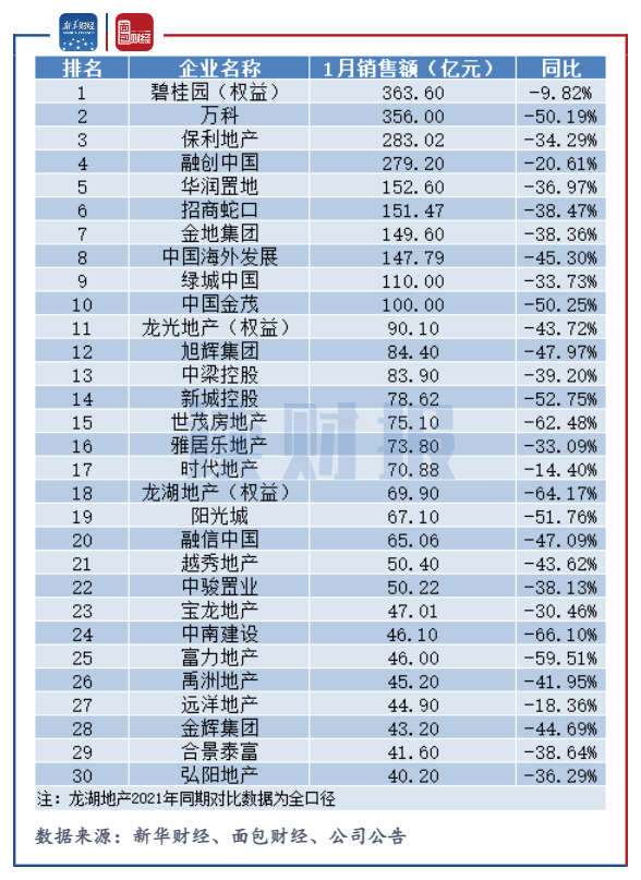 TOP30房企中,有10家房企1月銷售額超過100億元,銷售額均同比下降,平均降幅為35.80%。其中,中國金茂降幅最大,達到50.25%。