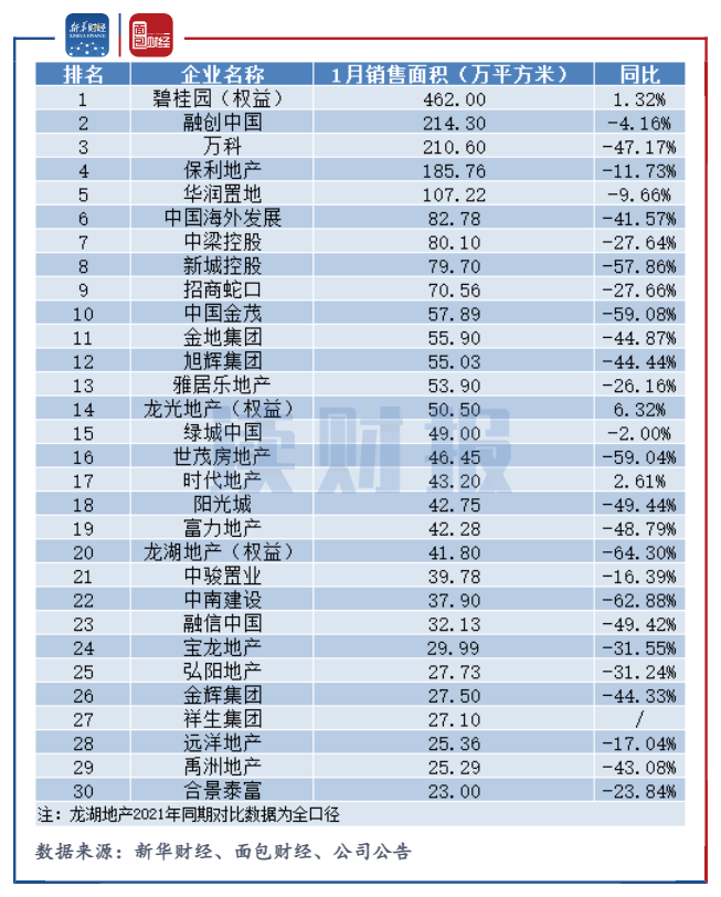僅有3家房企1月銷售面積同比實現增長。碧桂園1月實現權益銷售面積462萬平方米,同比增長1.32%,面積位居行業首位。龍光地產權益合同銷售面積50.5萬平方米,同比上升6.32%,增速位列第一;時代地產銷售面積43.2萬平方米,同比增長2.61%。