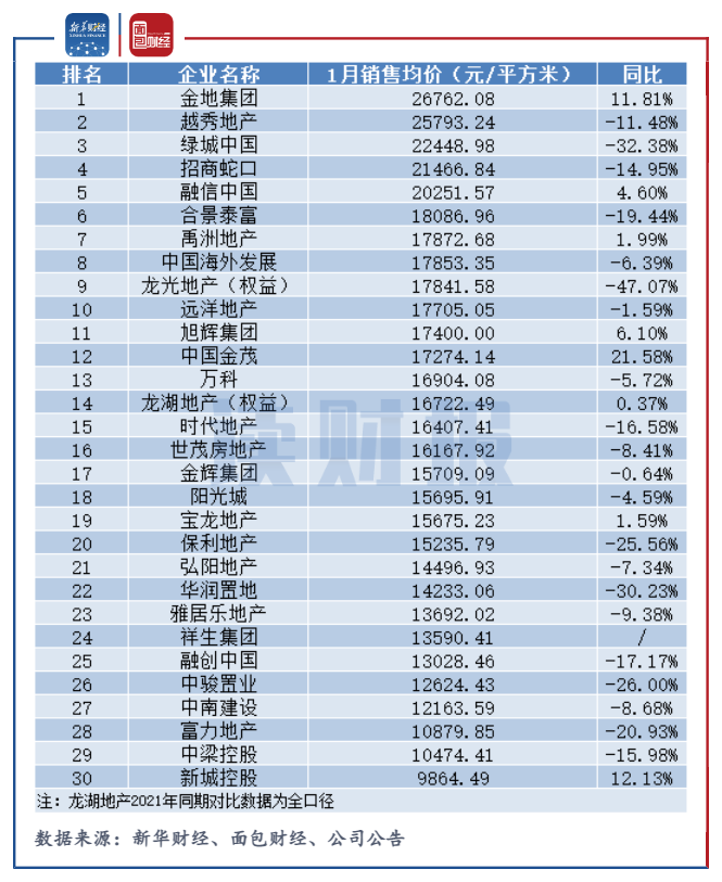 其中,金地集團2022年1月份銷售均價達到26762.08元/平方米,同比上升11.81%,銷售均價和增速均位居行業首位。越秀地產位居次席,銷售均價為25793.24元/平方米,同比下滑11.48%。其余房企中,銷售均價超過20000元/平方米的企業還包括綠城中國、招商蛇口及融信中國。