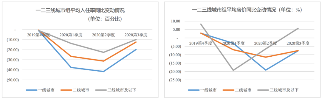 從不同等級城市組看,一二三線城市組酒店業(yè)在上半年均受疫情影響嚴(yán)重,三季度均有所好轉(zhuǎn),但不同等級城市組恢復(fù)情況有所不同。其中,一二季度房價(jià)和入住率下跌幅度從小到大為三線城市組、二線城市組和一線城市組,三線城市組酒店業(yè)受損相對較小;而三季度酒店業(yè)恢復(fù)程度由好到弱同為三線城市組、二線城市組和一線城市組。整體看,三線城市酒店業(yè)受疫情影響相對較小、恢復(fù)較快;而一二線城市酒店客源因全球疫情影響海外客源大幅減少并尚未完全恢復(fù),且一二線城市管控更嚴(yán),酒店業(yè)恢復(fù)程度較慢。